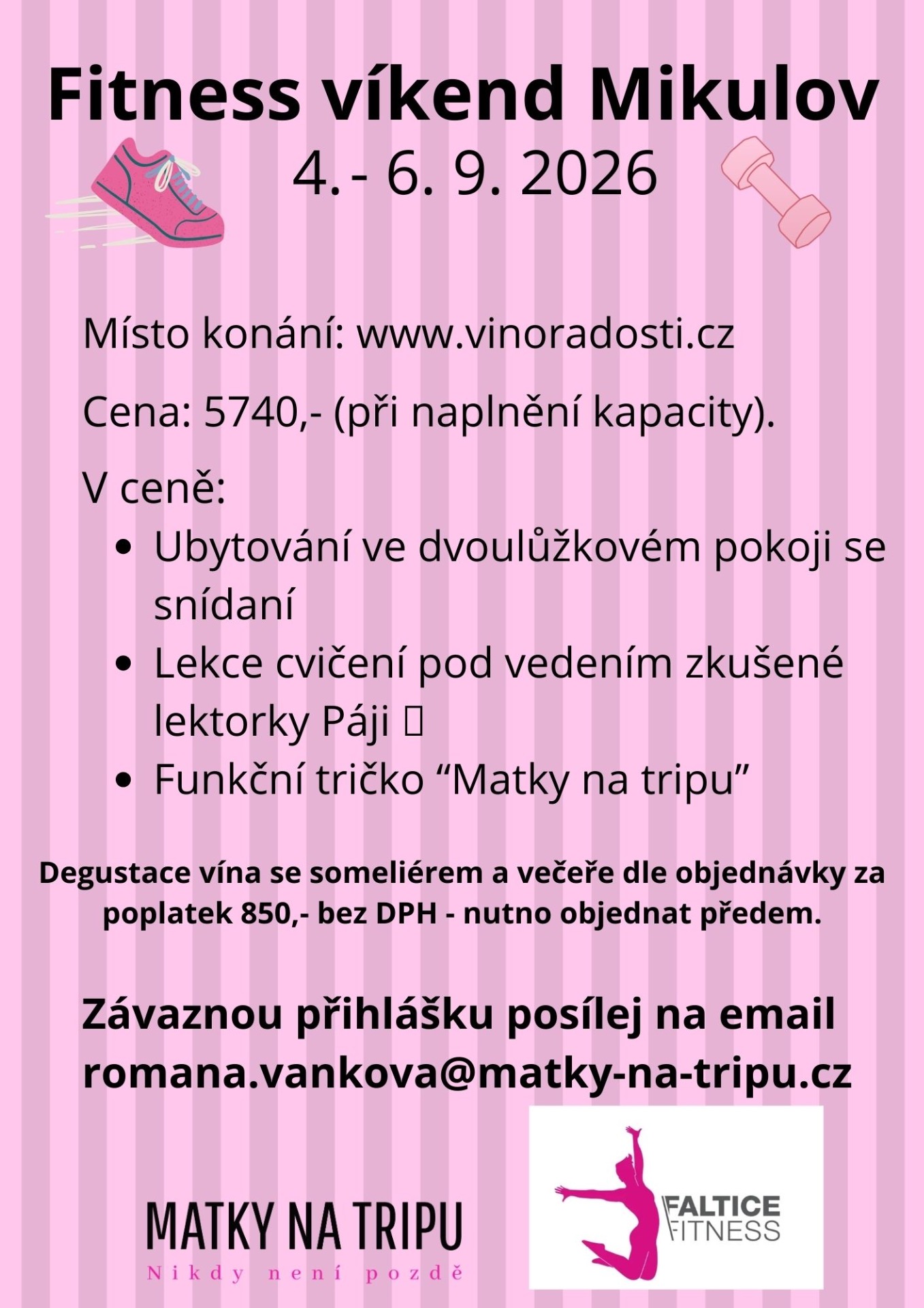 Tento víkend je ideální pro maminky, ženy, kamarádky i všechny, které si chtějí odpočinout, načerpat novou energii a zároveň si užít aktivní čas ve skvělé společnosti. Čeká nás také společný výběh na Svatý kopeček s nádherným výhledem na Mikulov, večerní degustace vína se someliérem a hlavně spousta smíchu, zábavy a pohodové atmosféry. Odjedete nejen s lepší kondicí, ale i s novou motivací, krásnými zážitky a možná i novými přátelstvími. Prostě víkend, na který budete ještě dlouho s úsměvem vzpomínat.